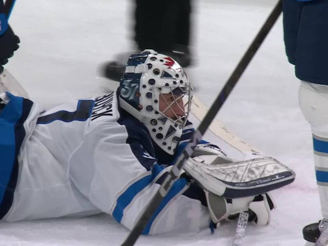 Watch as Winnipeg Jets goaltender Connor Hellebuyck stretches out to make a great save on Chicago Blackhawks superstar Connor Bedard.
