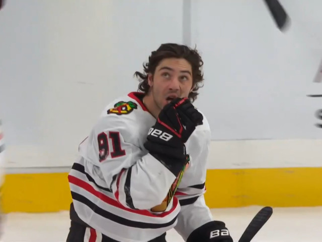 Watch as Chicago Blackhawks’ Frank Nazar gets jumped by Blues’ Jake Neighbours after driving to the net.