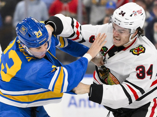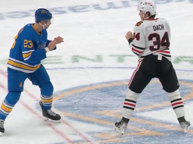 Watch as St. Louis Blues defenceman Logan Mailloux and Chicago Blackhawks forward Colton Dach drop the gloves in the first period of their matchup after exchanging some words in the neutral zone.