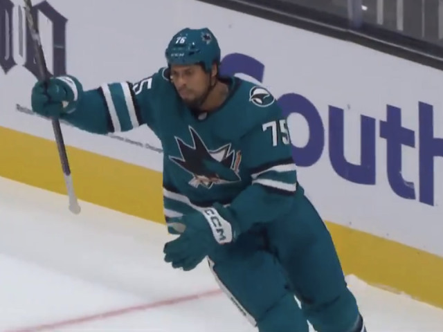 Watch as Ryan Reaves picks up the puck in the neutral zone and takes a defender wide before slipping the puck past Petr Mrazek for his first goal with the San Jose Sharks.