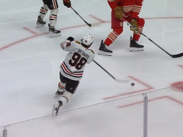 Watch as Chicago Blackhawks rising superstar Connor Bedard shows off his unreal release with a snipe against the Detroit Red Wings.