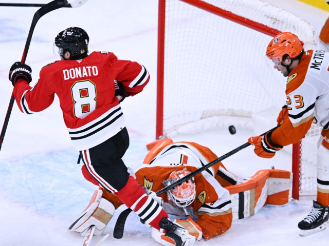 Ryan Donato scored from the edge of the crease at 2:58 of overtime and the Chicago Blackhawks beat Anaheim 2-1 on Sunday night in Ducks coach Joel Quenneville’s first game at United Center since being banned in a sexual assault scandal.