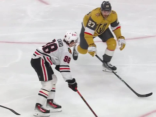 Watch was Chicago Blackhawks forward Connor Bedard collects speed in the neutral zone before showing off his super quick release to go bar down vs. the Vegas Golden Knights in the third period.