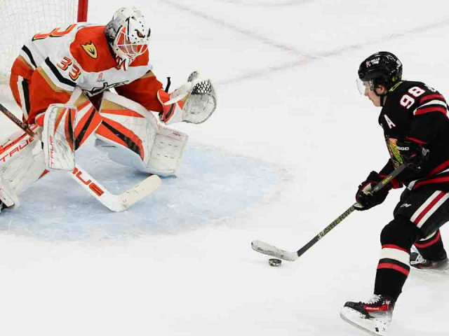 Watch as Chicago Blackhawks’ Connor Bedard shows off his wicked puck handling in front of the Ducks’ goal after Andre Burakovsky poked the puck free from Alex Killorn as the Blackhawks battle back from a three-goal deficit.
